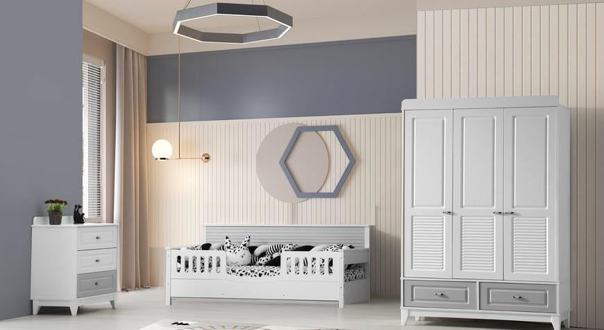 • Takımın parçaları arasında geniş depolama alanı sunan dolap, şifonyer ve sağlam karyola bulunmaktadır.