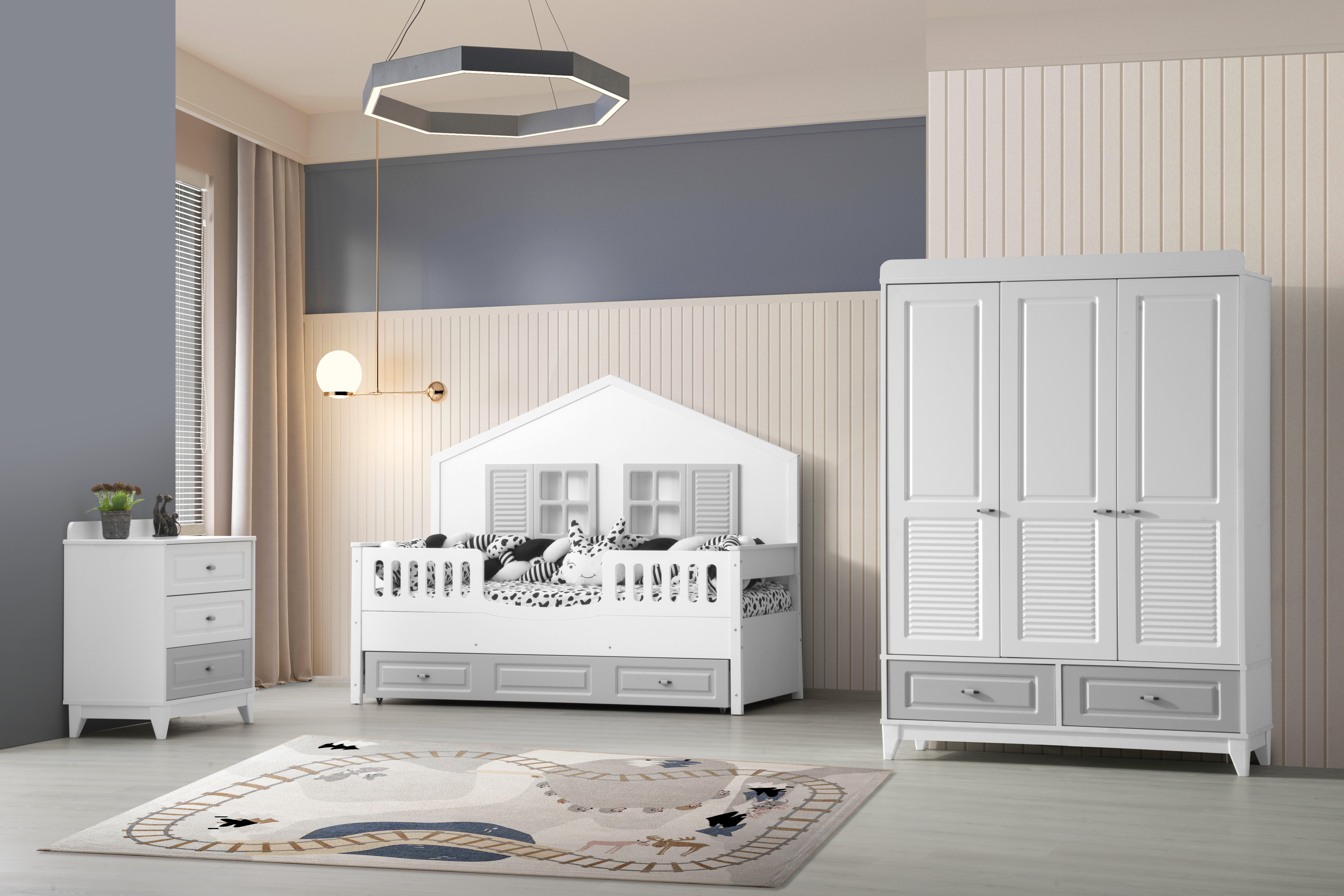 • Takımın parçaları arasında geniş depolama alanı sunan dolap, şifonyer ve sağlam karyola bulunmaktadır.