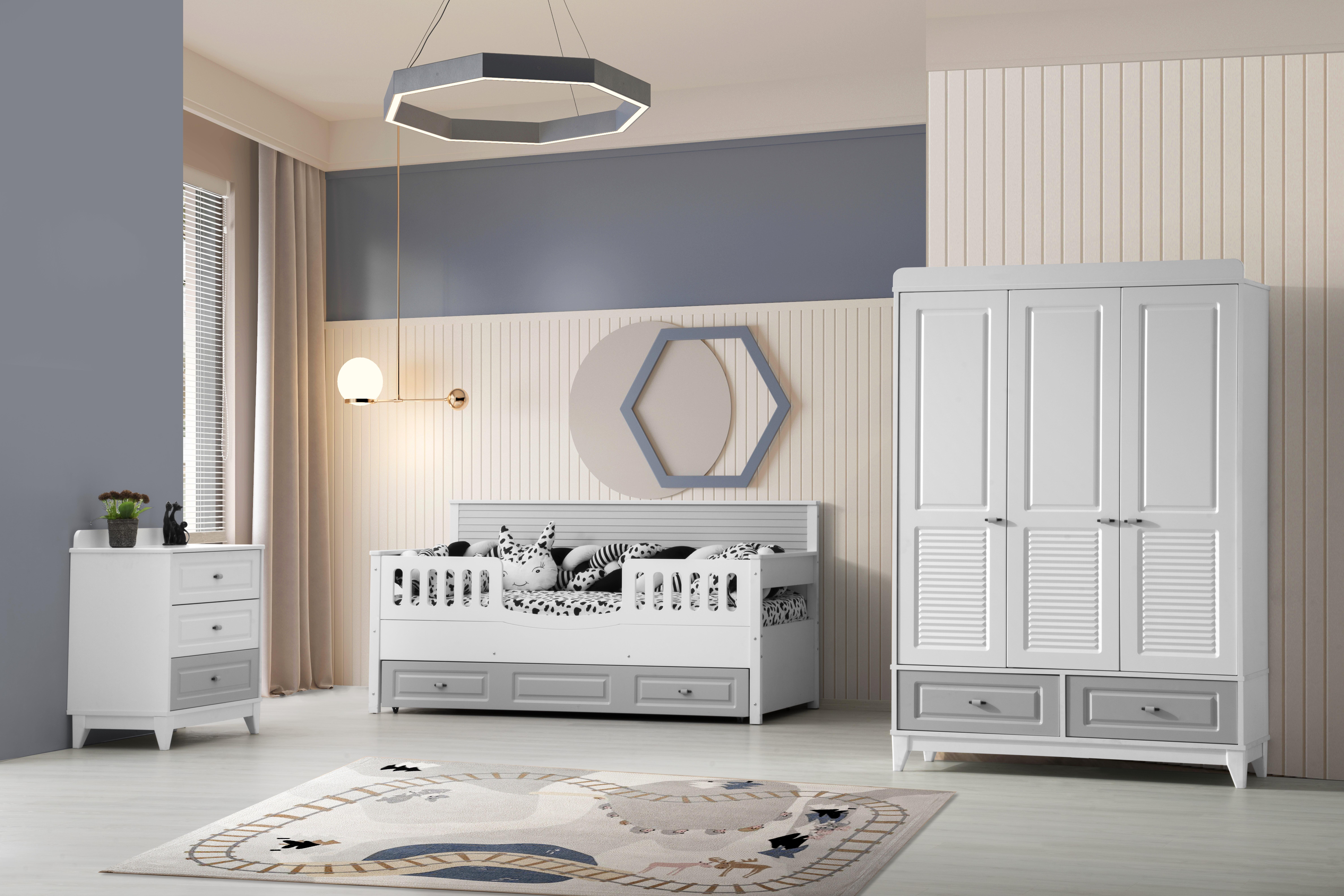 • Takımın parçaları arasında geniş depolama alanı sunan dolap, şifonyer ve sağlam karyola bulunmaktadır.
